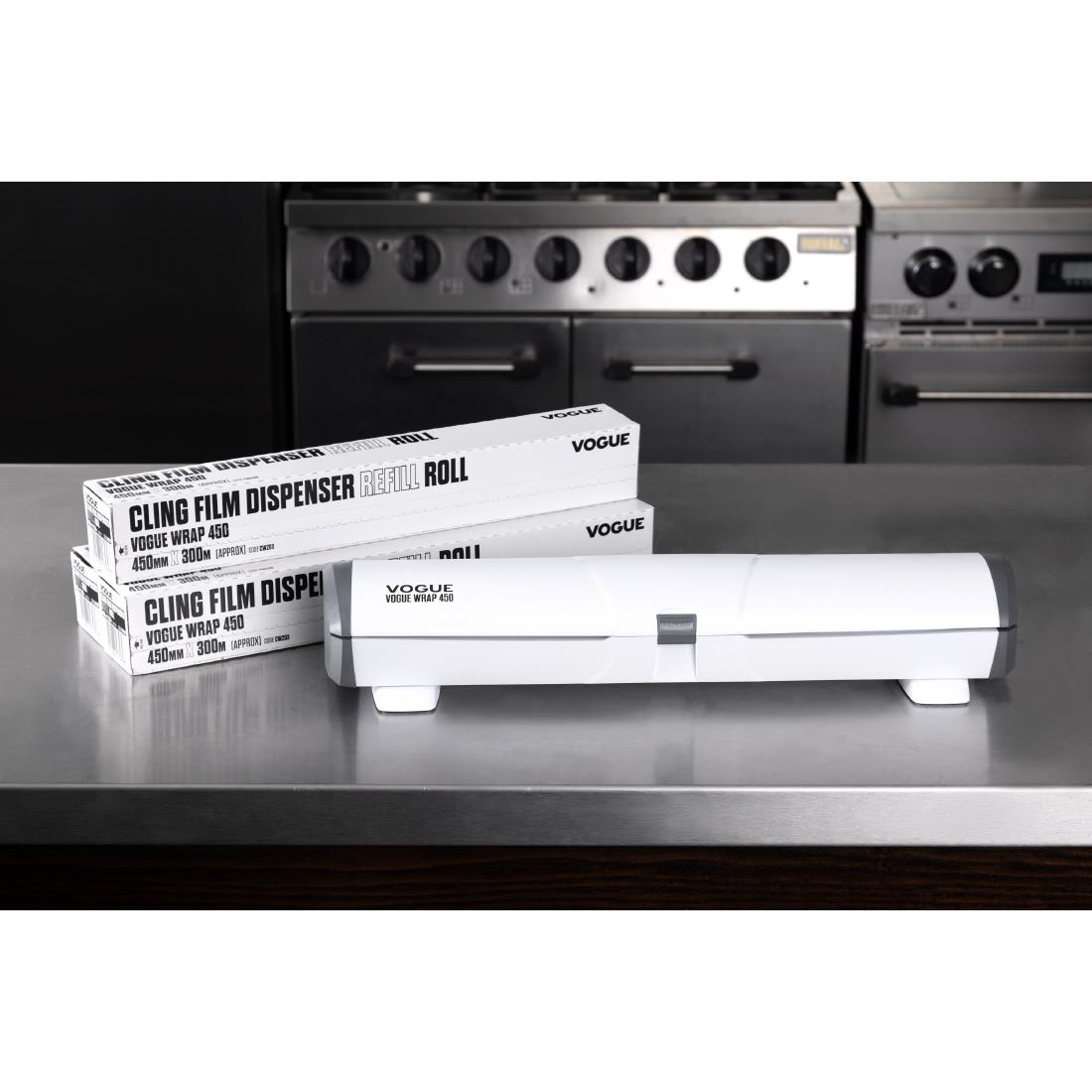 The dispenser is compatible with all Vogue Wrap 450 refills, including Eco Cling, Standard Cling Film, Foil, and Parchment.
