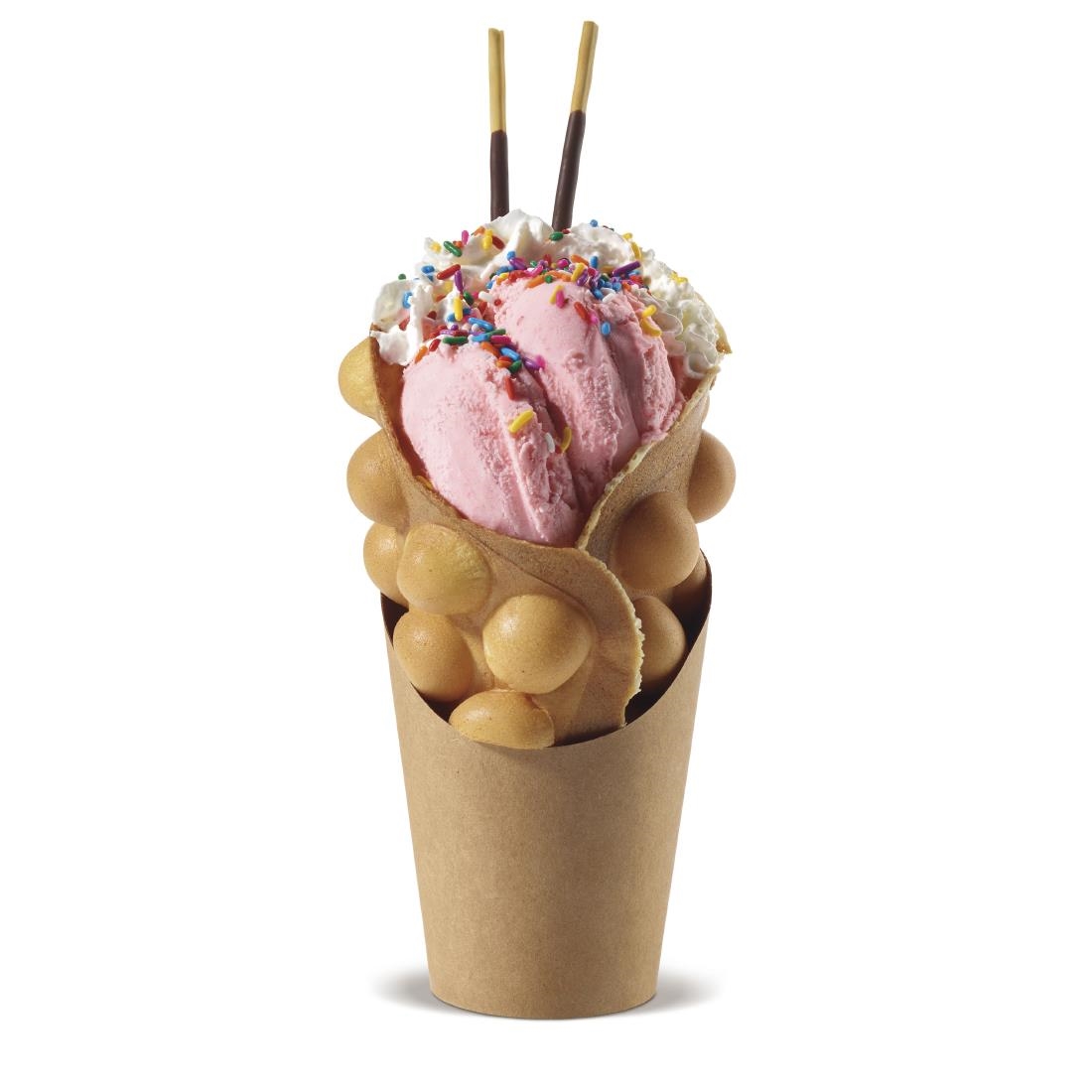 Bring the wildly popular Hong Kong-style street treat to your menu with this innovative unit. Designed with heavy-duty die-cast housing, it bakes up to 25 bubble waffles per hour and features a rotary mechanism that ensures even baking and browning. The triple-coated nonstick plates make the waffles easy to release, leaving them perfectly formed and ready to be filled with ice cream or served flat with sweet or savory toppings. An audible beep alerts users when to cook and when to serve. Cleanups are quick and easy with the removable, dishwasher-safe drip tray.