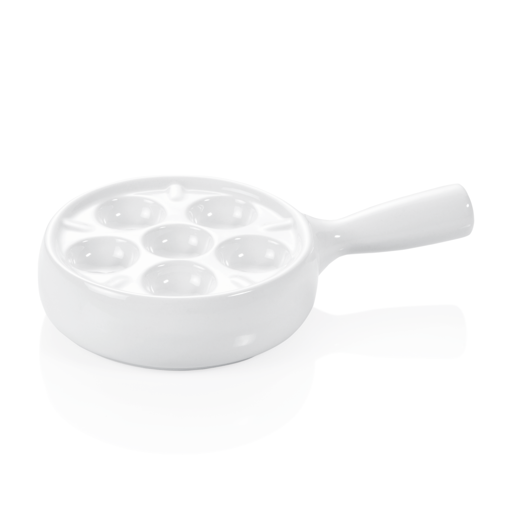 Six defined wells hold snails and garlic butter securely, cutting down on spills and delivering consistent portions every time. The compact 12 cm diameter saves space on crowded hot passes and trays, while twin side handles offer a confident grip for swift, safe service. Glazed porcelain provides dependable heat retention and a refined presentation that complements both casual and fine dining. Weighing 0.36 kg, it sits steadily on service boards yet remains easy to handle and clean between turns. Designed by WAS Germany and manufactured in China, it’s a durable, dependable piece for the professional kitchen.