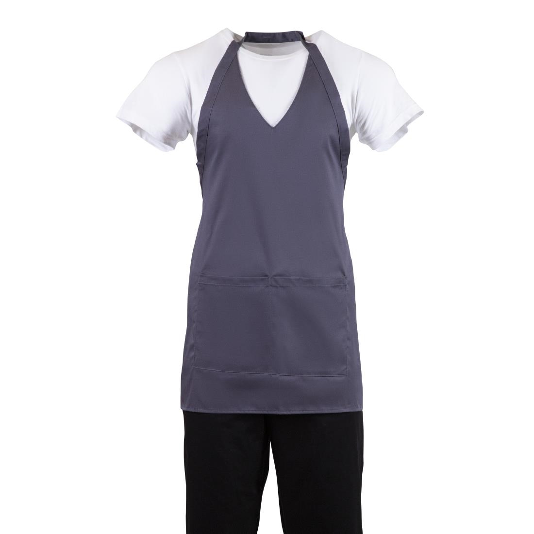 Provide a practical yet stylish appearance for your front-of-house staff with the Whites charcoal V-neck service apron. With a modern, smart look, the apron gives staff a uniform that is instantly recognizable to customers while also being comfortable to wear. Made from polycotton, the apron offers fantastic protection across the whole upper torso, while also being breathable—essential considerations during those hot, busy shifts. It's easy to put on, with two long straps allowing the ties to go around the front or be tied neatly around the back. Thanks to the easy-access front pocket, staff can have everything they need at hand, improving efficiency and reducing the amount of walking to retrieve small items.