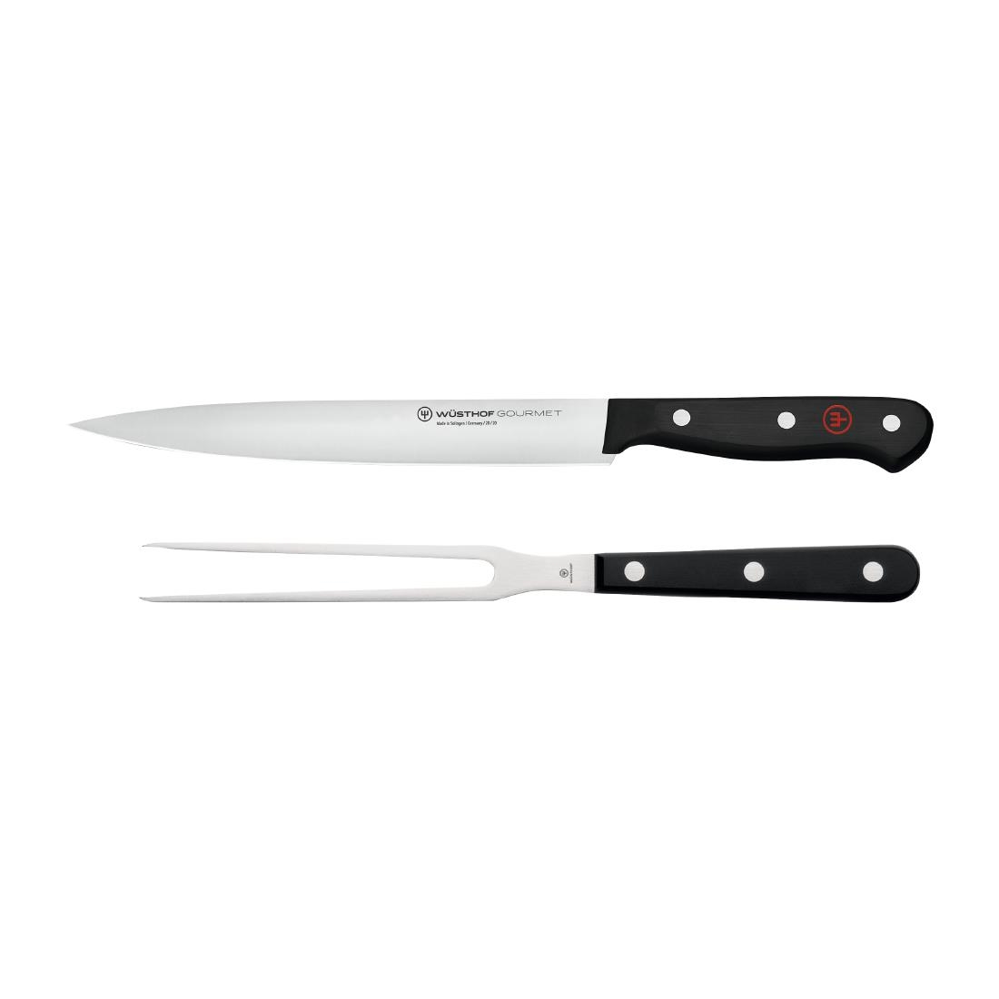 This Wüsthof Gourmet 2-piece set contains a carving knife and meat fork, for the perfect slicing and holding pair.
